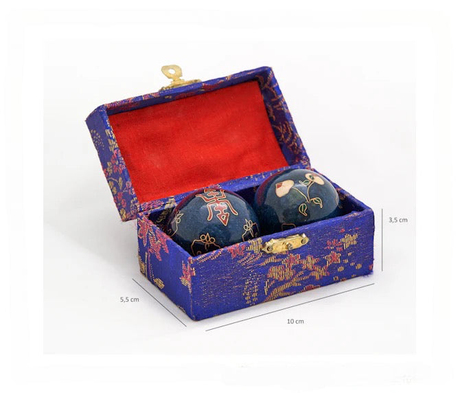 Incluyen caja de presentación y dos bolas decoradas con símbolos chinos.
