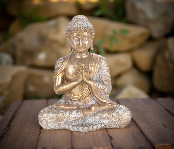 La postura de meditación, también llamada Dhyana Mudra, es una de las más utilizadas en el budismo para representar el camino hacia la iluminación a través de la concentración y la quietud. El color blanco simboliza la pureza y el renacimiento, mientras que el dorado representa la sabiduría y la abundancia espiritual.