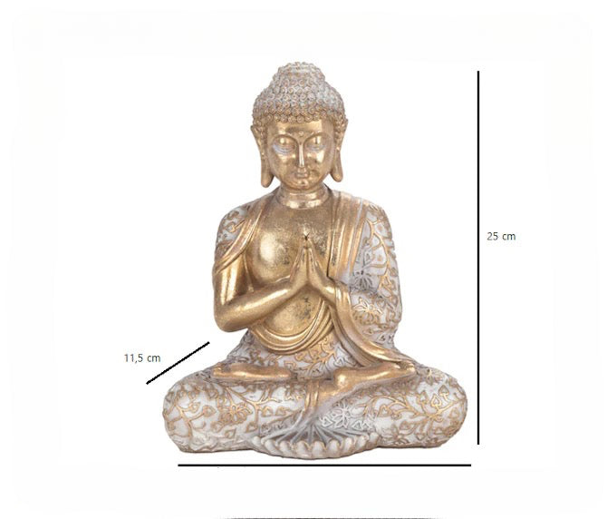 Este Buda en posición de meditación, acabado en tonos blanco y dorado, es una figura de alta vibración espiritual que invita a la calma, la introspección y la conexión con la paz interior.