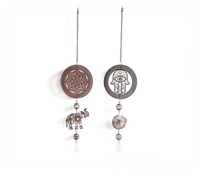 Estos colgantes móviles pequeños son una forma delicada y efectiva de armonizar tu espacio con símbolos protectores y energía en movimiento. Disponibles en dos variantes —uno con un elefante y otro con una mano de Fátima, ambos combinados con un mandala—, actúan como amuleto energético y armonizador sutil, ideales para entradas, habitaciones o rincones de meditación.