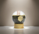 En su frontal luce una lámina dorada con el símbolo de la Flor de la Vida, un diseño sagrado que favorece la armonía, la regeneración y el equilibrio energético. Cada esfera es única, con ligeras variaciones que la hacen especial. (Base no incluida)
