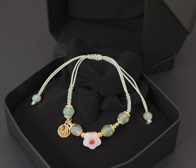 Esta delicada pulsera combina la fuerza protectora del cordón verde con la serenidad de las cuentas verdes de jade, símbolo de equilibrio y prosperidad. En el centro, una flor blanca adornada con un detalle dorado y cristal rojo ilumina la pieza, atrayendo pureza, amor sincero y renovación en cada etapa de la vida. El toque dorado representa la abundancia y la conexión con la energía del cielo, convirtiendo esta joya en un amuleto ideal para quienes buscan fortuna, amor duradero y protección energética en su día a día.