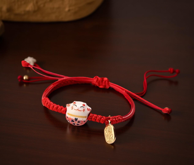 “Tu pulsera Maneki Neko ya está lista para acompañarte. Este gato de la suerte trae consigo prosperidad y alegría, y el rojo del cordón refuerza la protección y la vitalidad. Llévala contigo cada día como símbolo de buena fortuna.”