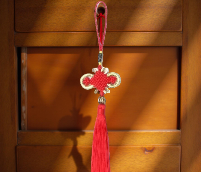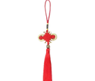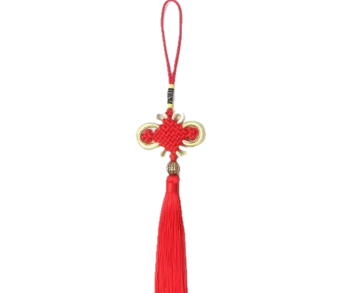 Este delicado amuleto tradicional combina tres poderosos símbolos de la cultura china: el nudo infinito, la bola dora y una borla decorativa en hilo rojo. Cada parte del diseño tiene un profundo significado: el nudo representa la eternidad, la bola dorada la prosperidad y el hilo rojo protege frente a malas energías.